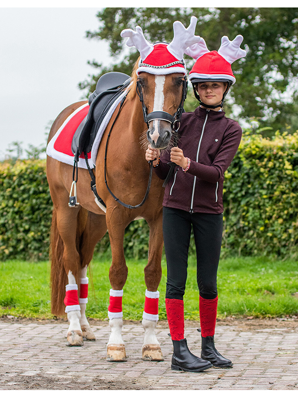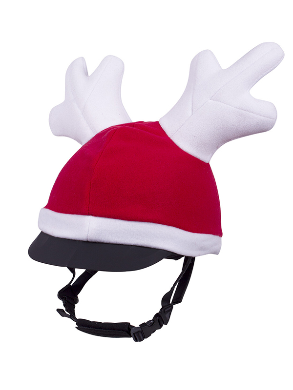 Hat with reindeer antlers which can be worn over a safety helmet. The hat has a white edge and antlers. Fabric composition: 100% polyester