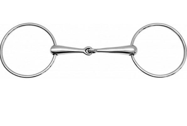 Single jointed, medium mouthpiece and in stainless steel. Bit thickness : 18 mm Ring diameter : 90 mm
